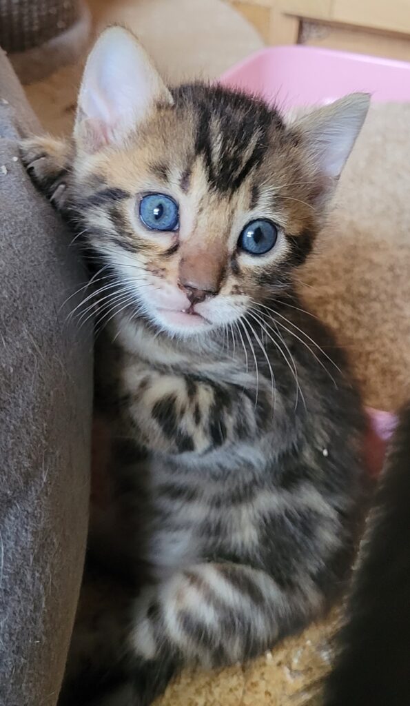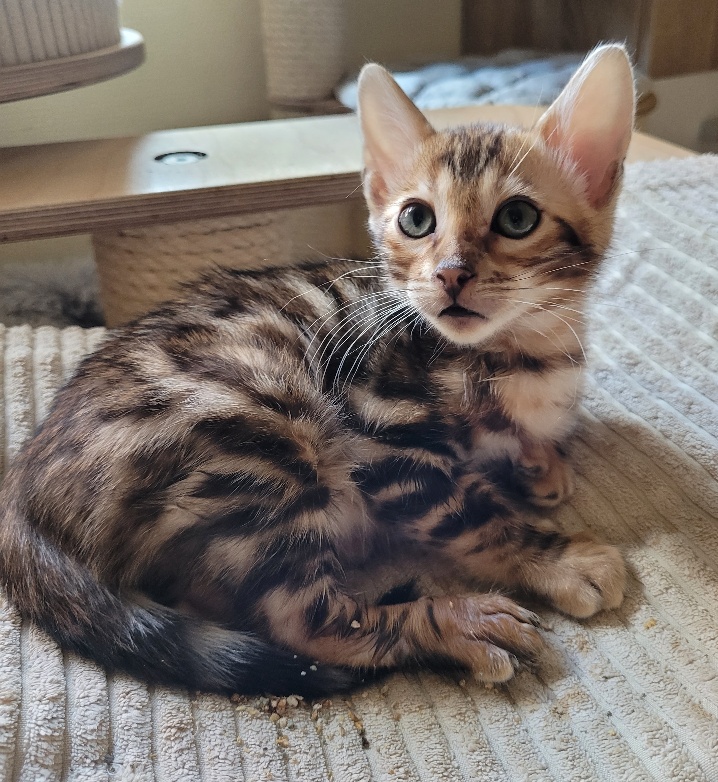 Marie ist ein niedliches Bengalmädchen. Sie ist unheimlich verkuschelt. Sie kann ganz viel Zeit mit Schmusen verbringen. Sie liegt unheimlich gern auf dem Schoß und lässt sich streicheln und verwöhnen. Genauso gern jagt sie aber kleine Plüschmäuse oder tobt mit ihren Geschwistern.