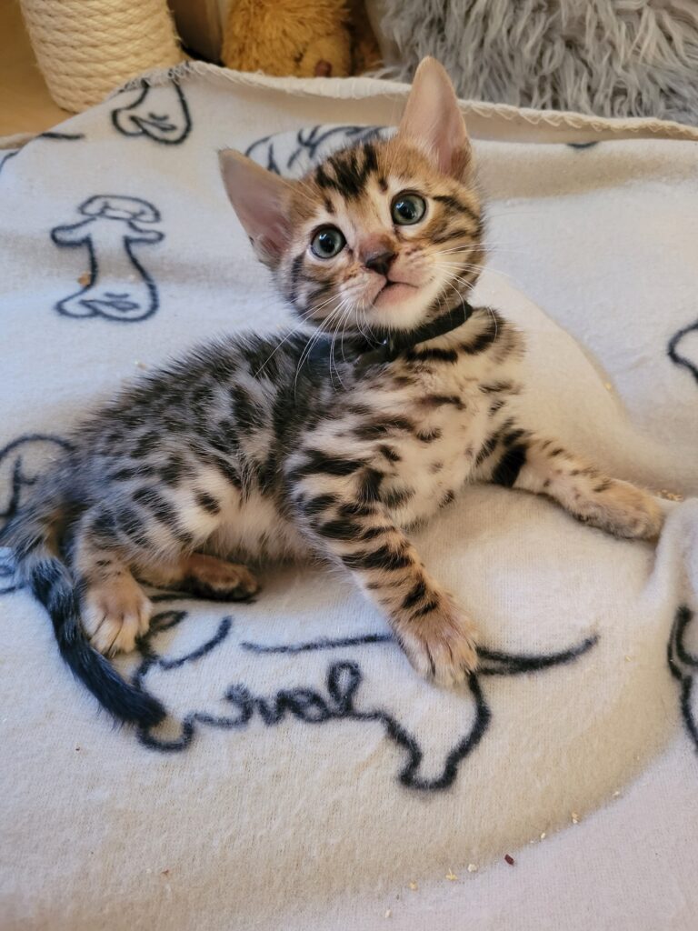 Otto ist ein sehr liebenswerter kleiner Bengaljunge. Er ist sehr verkuschelt und liebt es gestreichelt zu werden. Er ist im Moment der Ruhigste aus dem Wurf. Trotzdem kann er natürlich auch ganz bengaltypisch sein, indem er mit seinen Geschwistern durchs Haus tobt und sehr verspielt und neugierig ist. Aufgrund seiner kleinen dunklen Nase hat er einen megasüßen Gesichtsausdruck.